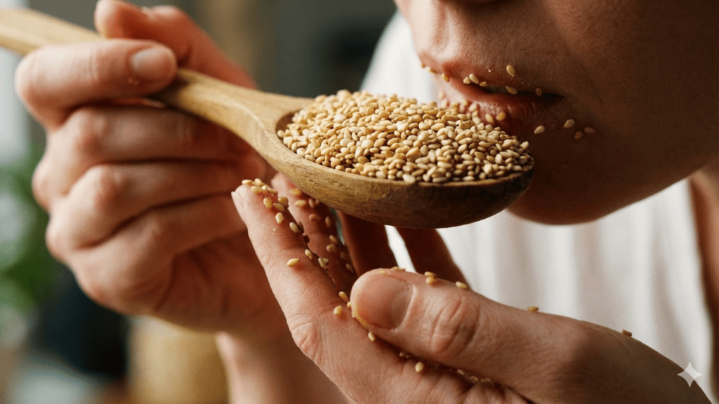 - Começar com pequenas quantidades diárias, como uma colher de chá de gergelim.