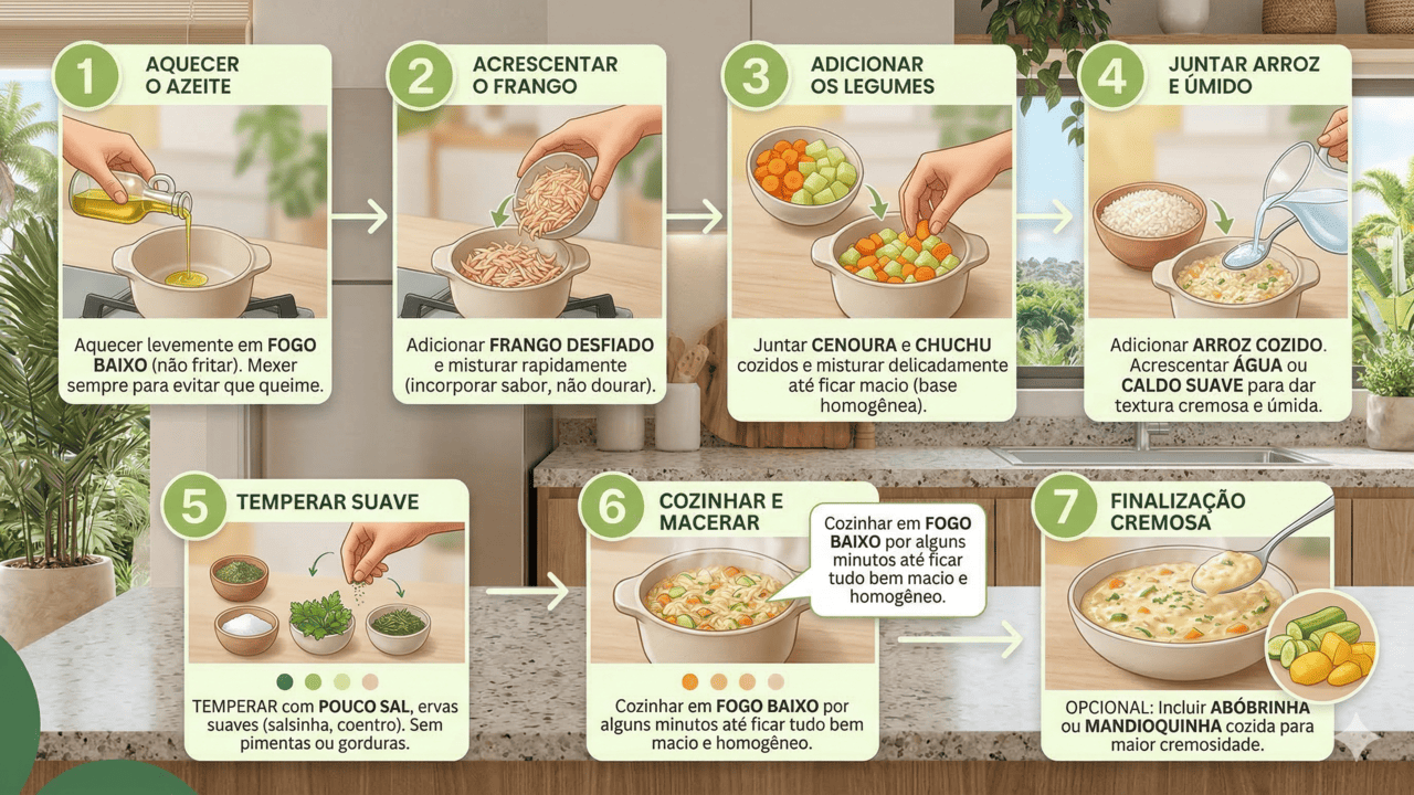 Veja um exemplo simples de prato que costuma ser bem aceito em muitos casos de gastrite, por ter textura macia, sabor suave e pouca gordura, podendo ser adaptado às orientações do seu profissional de saúde. É uma base flexível, em que você pode variar alguns legumes conforme a tolerância.