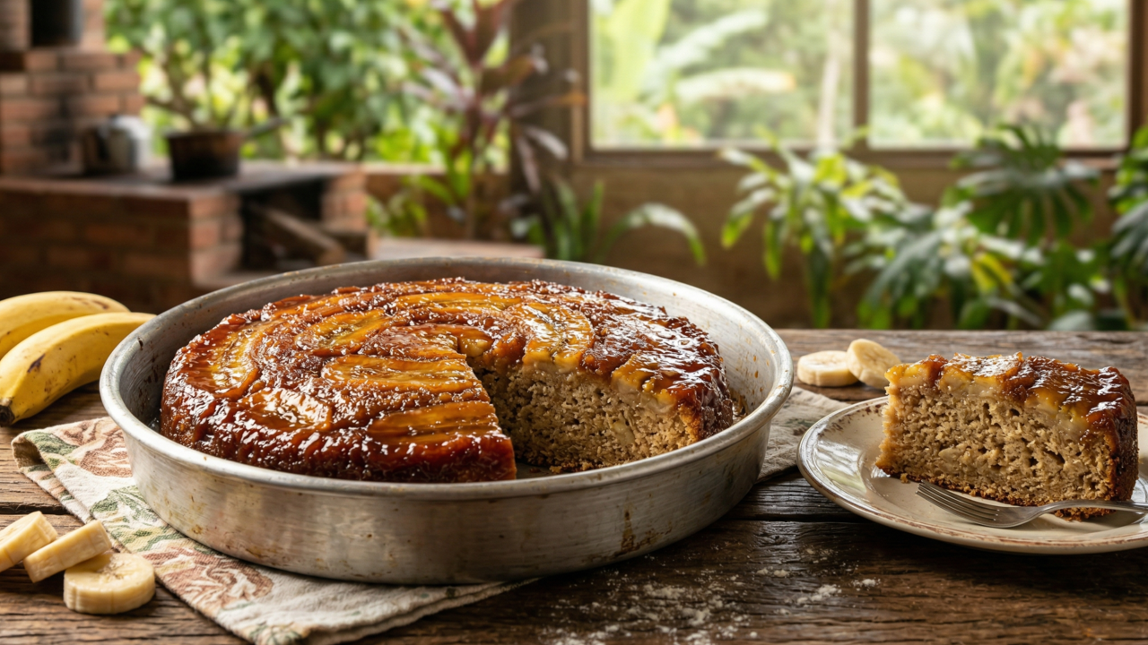 Adicionar uma pequena quantidade de água quente ao açúcar derretido ajuda a manter a calda maleável e evita que ela endureça excessivamente após esfriar. A interação entre o calor do forno e o açúcar caramelizado carameliza as bananas de forma uniforme e muito suculenta. O visual dourado é o diferencial que torna esse bolo visualmente irresistível para seus convidados.