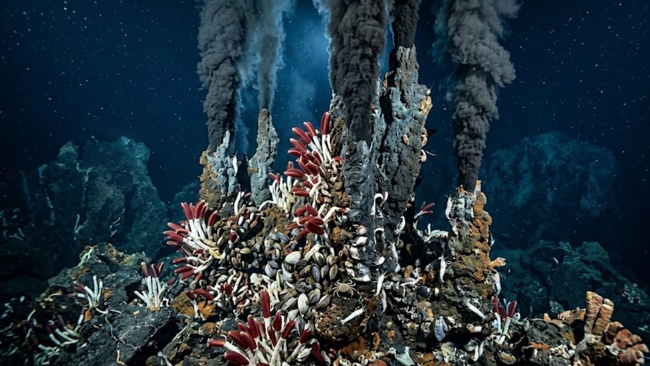 As fontes hidrotermais funcionam como chaminés submarinas que expelem fluidos superaquecidos e ricos em minerais tóxicos