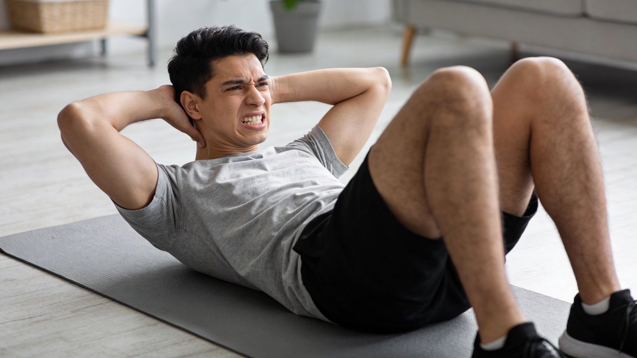 O erro comum ao fazer abdominal é puxar o pescoço com as mãos durante a subida, gerando uma tensão perigosa na cervical. Essa falha de postura impede que você queime a gordura localizada e ainda sobrecarrega as vértebras, causando dores crônicas nas costas.