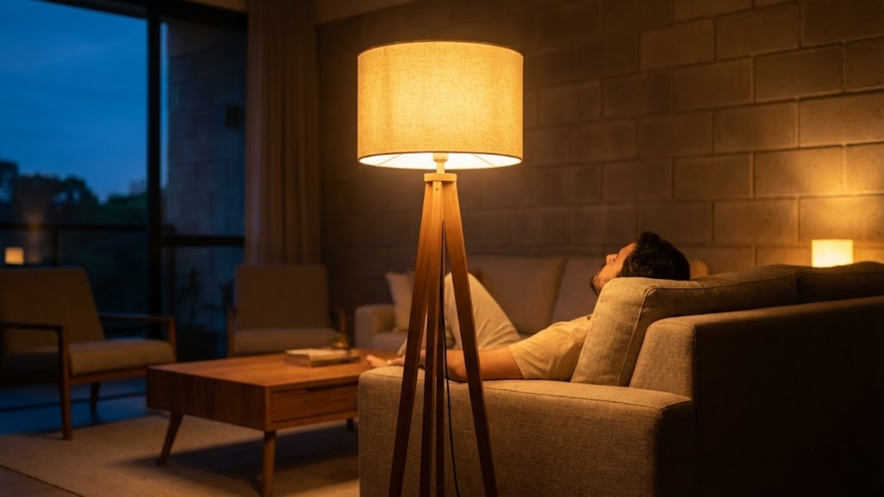 Você não precisa trocar todas as lâmpadas do teto de uma vez se o orçamento estiver curto. Comece investindo em abajures ou luminárias de piso com luz amarela para criar cenários indiretos à noite.