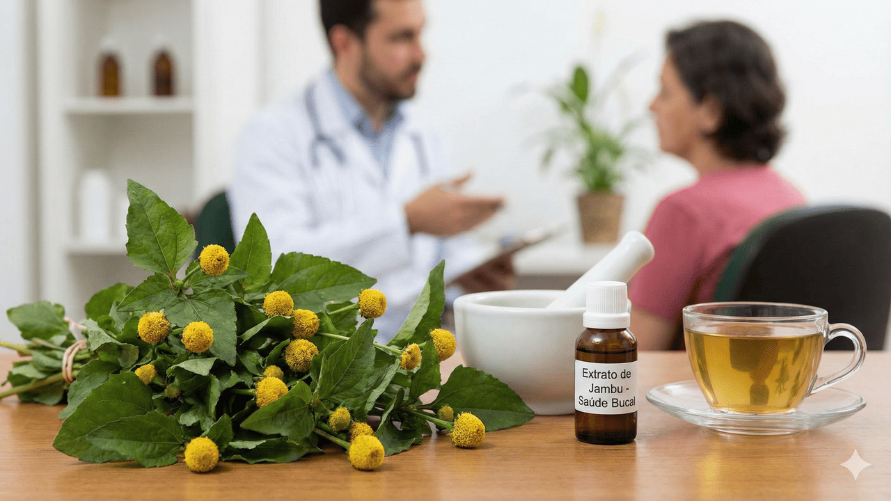 Modo de uso prático: Para dor de dente ou pequenas inflamações bucais, mastigue levemente uma folha fresca de jambu ou aplique extrato da planta (tintura) na área afetada. O efeito de dormência geralmente ocorre em poucos segundos.