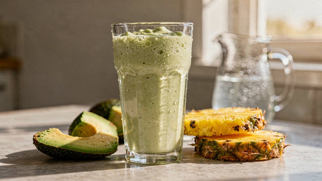 Vitamina cremosa de abacate e abacaxi sob a luz vibrante da manhã