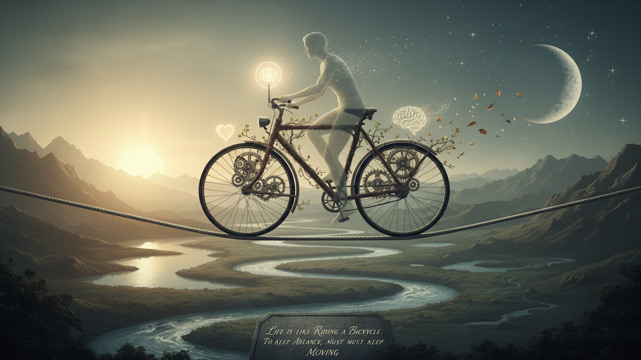 A metáfora da bicicleta remete a três elementos centrais: movimento contínuo, equilíbrio dinâmico e direção. O equilíbrio não é um estado fixo, mas algo que se ajusta o tempo todo, de acordo com a velocidade, o terreno e o contexto emocional ao redor, tal como ocorre em mudanças no trabalho, na saúde ou na vida familiar.