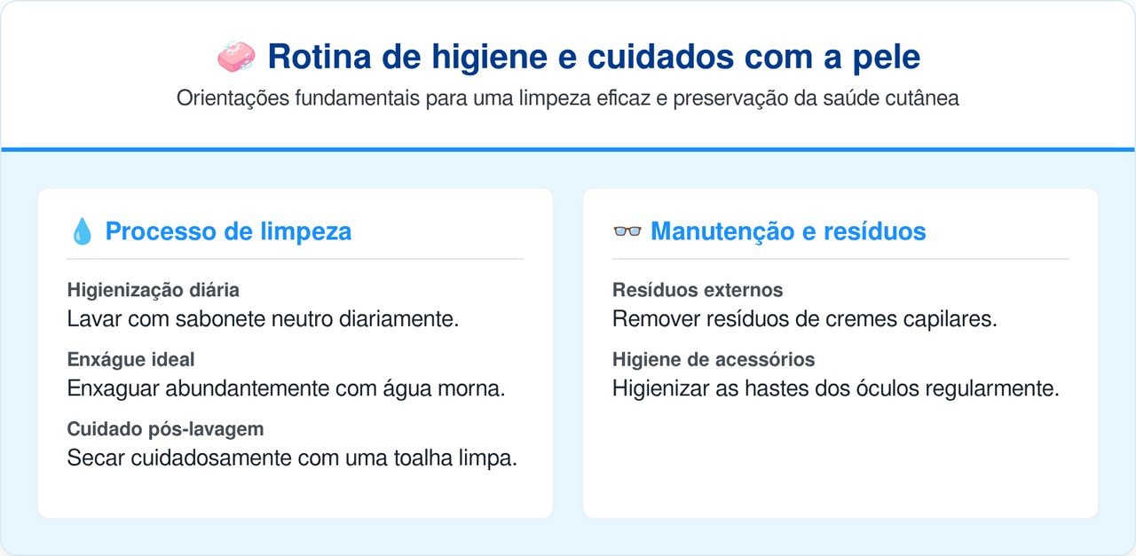 A higienização correta deve ser feita com as pontas dos dedos e sabonete suave durante o banho morno diário. É fundamental realizar movimentos circulares leves para remover o sebo sem agredir a pele, garantindo que toda a dobra auricular seja alcançada. O enxágue deve ser minucioso para que nenhum vestígio de espuma permaneça retido, evitando assim futuras irritações químicas.