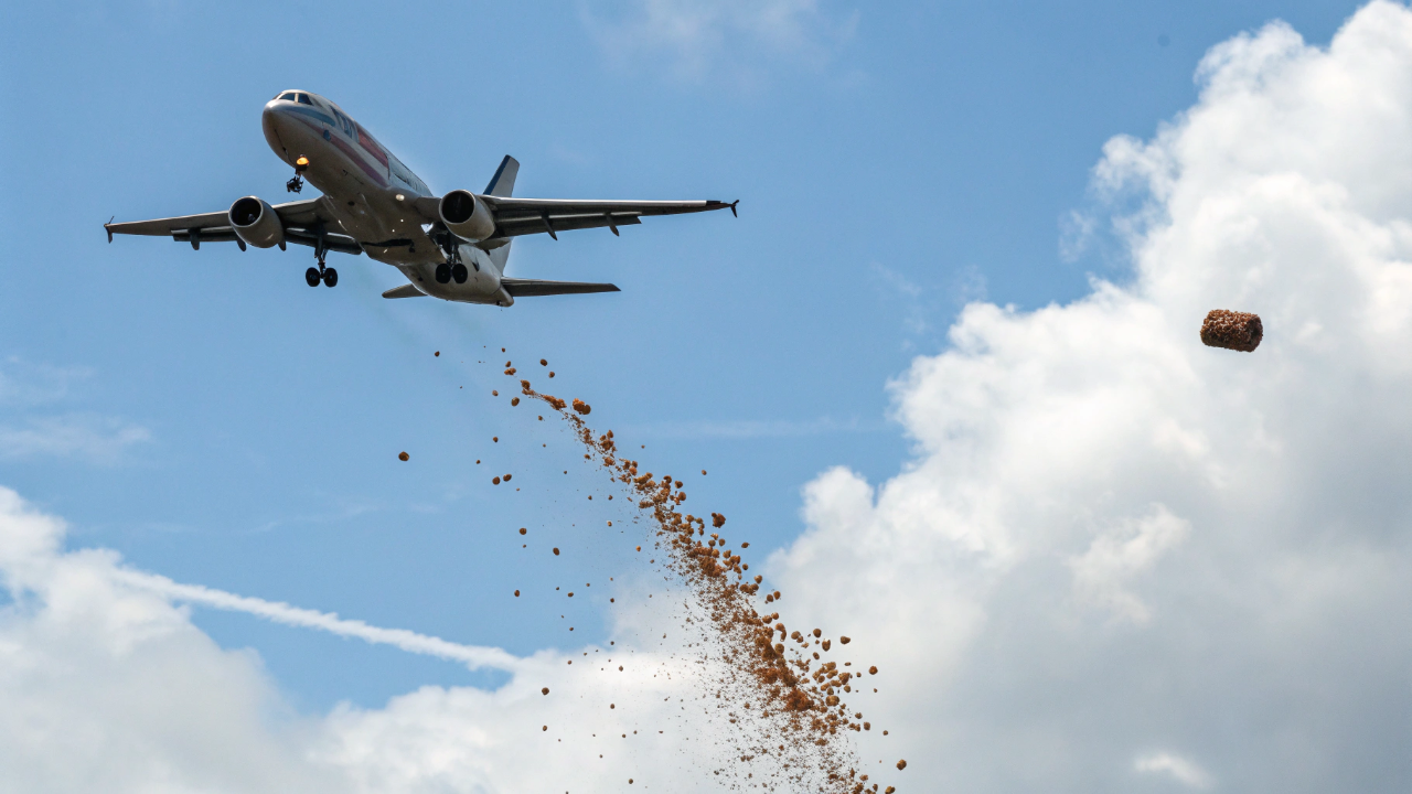 Essa é uma das maiores dúvidas de quem voa. Apesar da sensação de “sucção extrema”, nada é liberado no ar durante o voo. Todo o material fica armazenado com segurança dentro da aeronave.