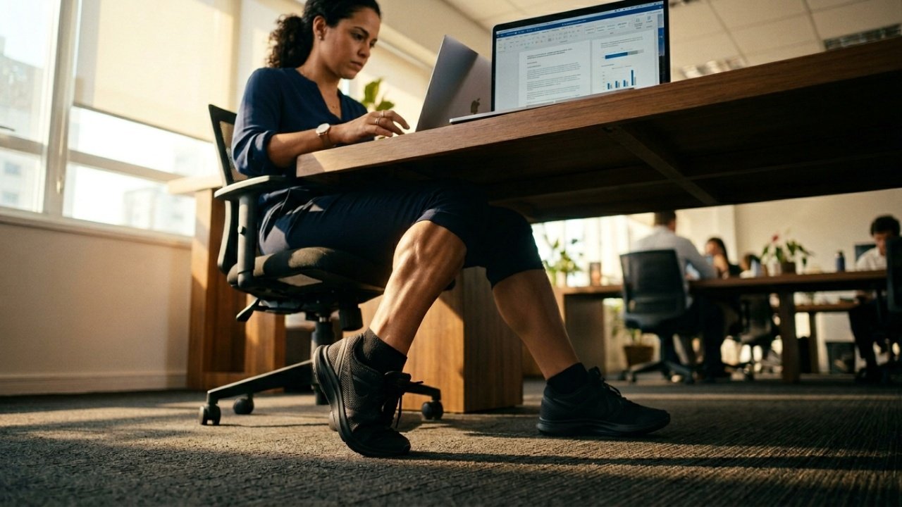 A prática contínua de levantar os calcanhares enquanto está sentado ativa um pequeno músculo capaz de consumir o açúcar circulante rapidamente. Esse movimento contínuo e sutil, conhecido nos laboratórios como flexão do sóleo, transforma o tempo de descanso na cadeira em um potente e resistente motor de queima metabólica estrutural.