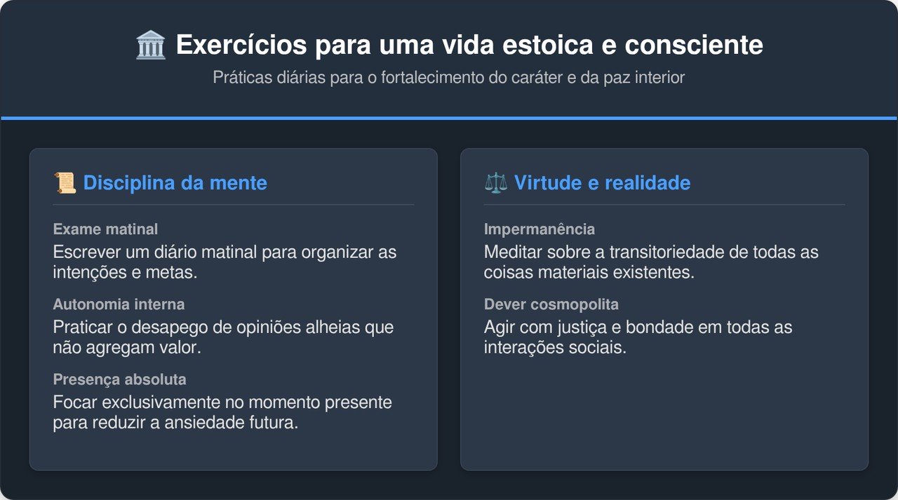 Praticar o exame de consciência ao final de cada jornada permite identificar padrões de pensamento que precisam de correção imediata. Marco Aurélio sugeria que devemos nos perguntar constantemente se nossas ideias são úteis para o bem comum. Substituir reclamações por gratidão e ação virtuosa altera a química cerebral e promove um estado de tranquilidade sólido e duradouro.