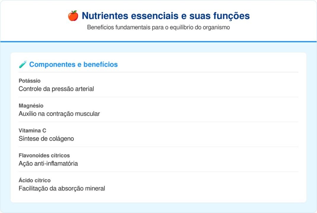 O fruto cítrico é uma fonte riquíssima de minerais essenciais que atuam em conjunto para regular o pH do sangue e fortalecer a imunidade. A combinação de potássio e magnésio auxilia na manutenção do ritmo cardíaco estável, enquanto as fibras solúveis presentes na casca e na polpa ajudam no controle glicêmico e na saciedade.
