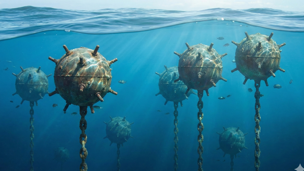 Minas marítimas são artefatos explosivos projetados para detonar quando detectam a presença de embarcações, explicam especialistas em defesa naval. Elas podem ser ativadas por contato físico, pressão da água, campos magnéticos ou até ruídos produzidos por navios e submarinos.