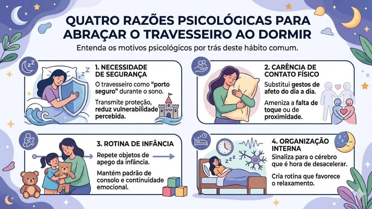 A interpretação sobre o que significa dormir abraçado com travesseiro varia de pessoa para pessoa, mas alguns motivos emocionais aparecem com frequência. Eles ajudam a entender por que esse simples hábito pode dizer tanto sobre necessidades internas, mesmo quando não são totalmente conscientes ou fáceis de nomear.