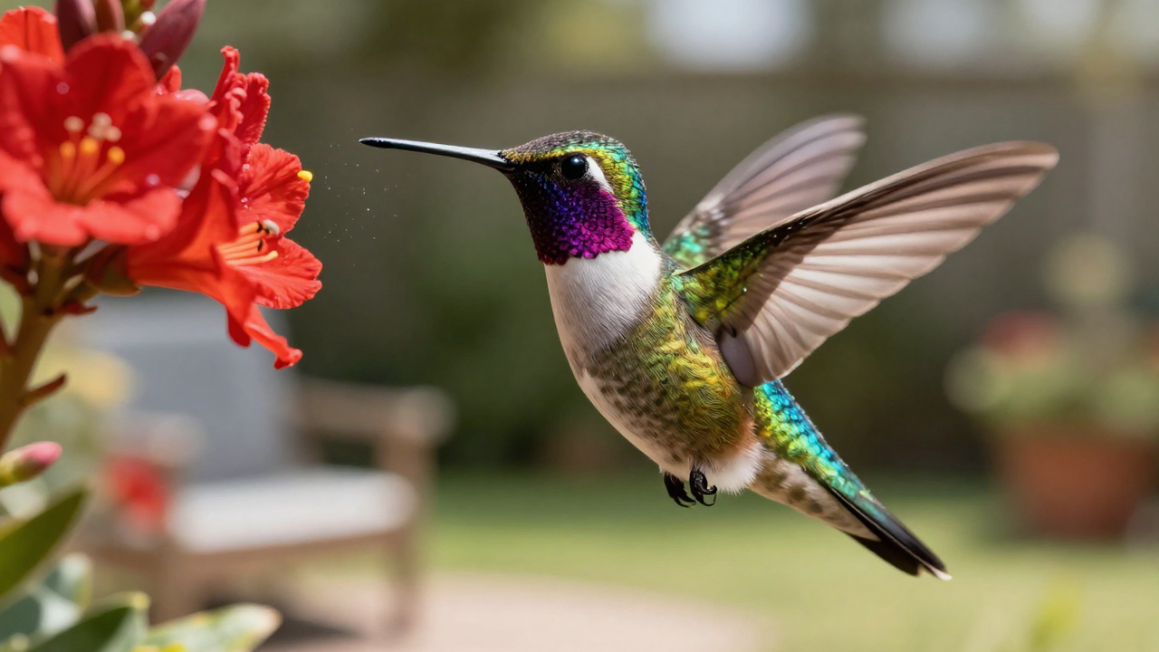 Beija-flor vibrante pairando em jardim residencial sob luz solar: entenda os significados espirituais e biológicos por trás da visita desta ave, frequentemente associada à alegria, cura e mensagens de boa sorte.