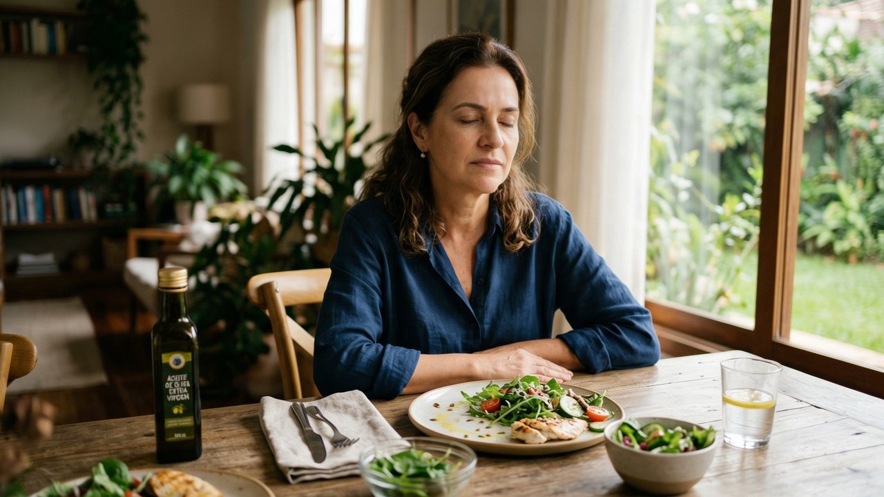 A qualidade do que você coloca no prato determina a intensidade da sua disposição nas horas seguintes ao consumo. Proteínas magras combinadas com gorduras boas, como o azeite de oliva, promovem uma liberação de açúcar no sangue muito mais lenta, o que evita o colapso energético típico das dietas baseadas em ultraprocessados.