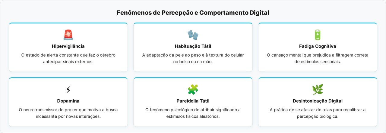 A Síndrome da Vibração Fantasma é definida como uma pareidolia tátil, onde o cérebro interpreta erroneamente estímulos físicos comuns, como o roçar da roupa ou uma leve contração muscular, como um sinal do aparelho. Esse erro de processamento acontece porque a mente está em um estado de hipervigilância, aguardando constantemente por uma nova interação social ou alerta digital.