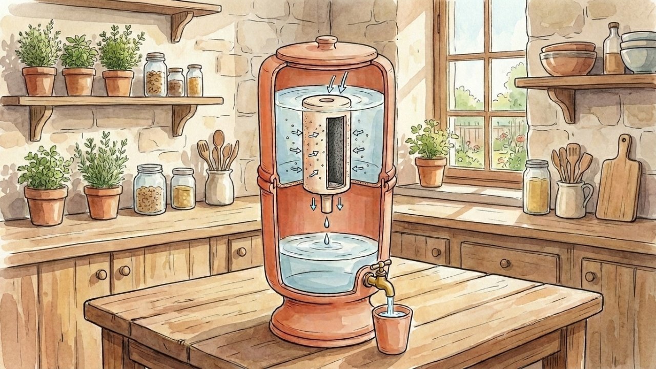 Durante essa longa e arrastada passagem silenciosa diurna, o líquido atravessa rigorosamente uma espessa vela cerâmica altamente porosa. Essa enorme barreira sólida retém pequenas partículas de sujeira e parte das microscópicas bactérias nocivas, entregando finalmente uma bebida bastante clara e perfeitamente livre de perigosos sedimentos urbanos invasores.