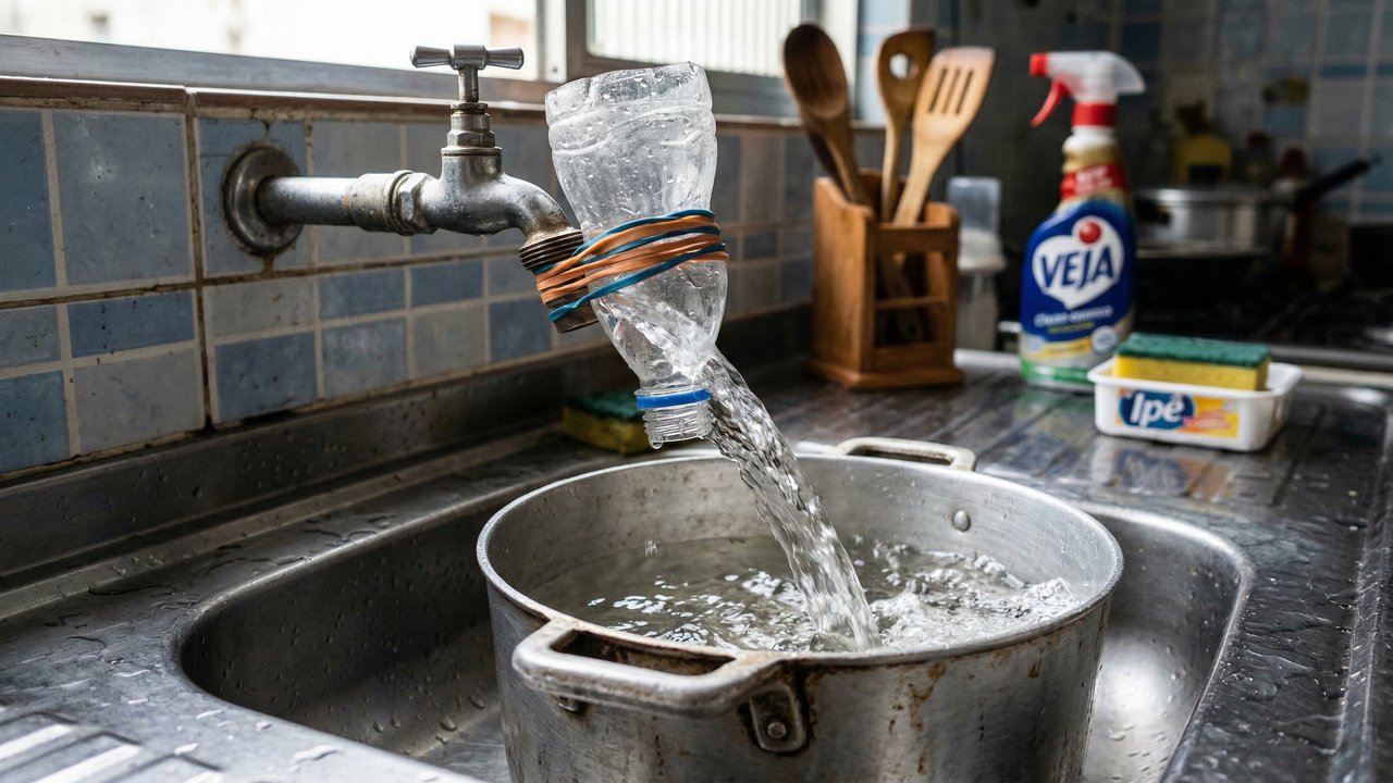 A utilização de uma garrafa PET como extensor de torneira transforma a lavagem pesada de louças. Essa adaptação caseira direciona a água com máxima precisão e agiliza bastante a rotina na cozinha.