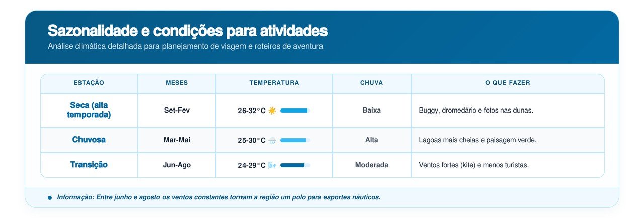 A pergunta virou bordão nacional. Antes de arrancar o buggy, o bugueiro oferece ao turista duas versões do passeio: a tranquila, com paradas para fotos, e a radical, com manobras nas cristas das dunas móveis. O percurso atravessa morros de areia branca que podem ultrapassar 20 metros de altura e mudam de forma a cada semana pela força dos ventos.