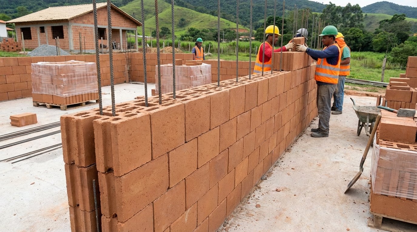 Essa característica elementar da alvenaria estrutural exclui de vez a cruel necessidade de quebrar a barreira recém-construída com pesadas marretas. O construtor focado posiciona as caixas de tomada elétrica e os registros sanitários durante a própria subida manual das fiadas de barro.