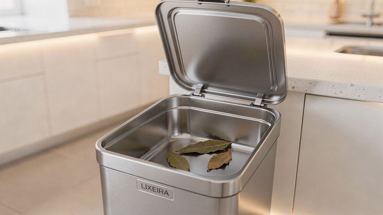 O truque da folha de louro no fundo da lixeira afasta as moscas de frutas rapidamente e neutraliza aquele odor horrível que toma conta de toda a cozinha. Essa planta aromática e barata funciona como um poderoso repelente natural, deixando o ambiente perfeitamente limpo na rotina.