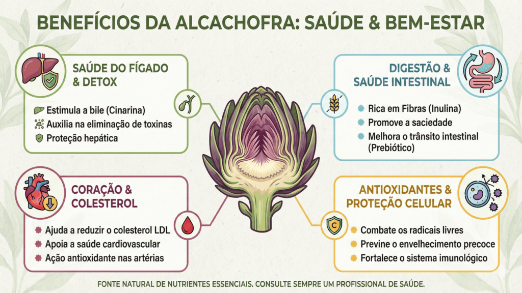Estudos apontam que seus extratos e folhas concentram compostos como cinarina, ácidos fenólicos e flavonoides, associados a efeitos benéficos sobre o fígado. Essas substâncias podem favorecer o fluxo da bile, envolvida na digestão de gorduras, e colaborar com a eliminação de resíduos e subprodutos do metabolismo.