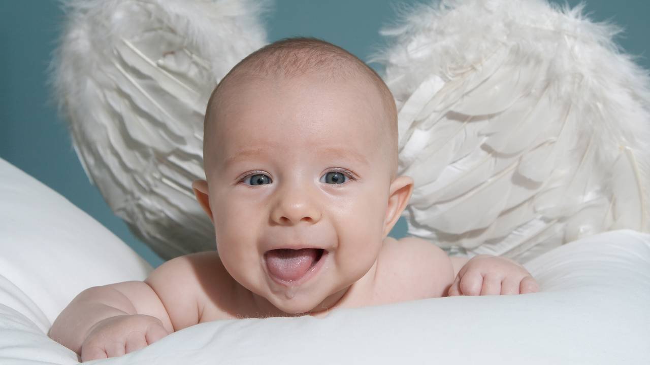 Bebê anjo simboliza pureza infantil com asas e halo, usado para recém-nascidos ou luto por perda precoce de crianças. // Créditos: depositphotos.com / PhotoVideo