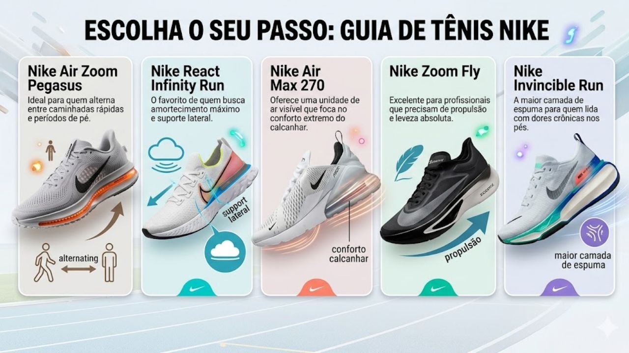 Verifique sempre a respirabilidade do material, pois tecidos como o Flyknit permitem que o suor evapore rapidamente, mantendo a higiene em dia. Atenção para o tamanho correto: como os pés costumam inchar após oito horas de trabalho, escolher um número com folga mínima pode salvar sua jornada em Belo Horizonte ou Porto Alegre.
