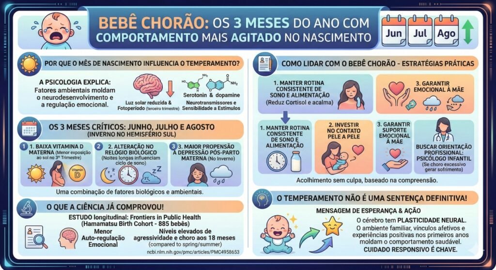 Um estudo longitudinal publicado no periódico Frontiers in Public Health, conduzido pela equipe do Hamamatsu Birth Cohort (HBC Study) com 885 bebês, demonstrou que crianças nascidas no inverno apresentaram menor capacidade de autorregulação emocional e níveis mais elevados de agressividade e choro aos 18 meses, em comparação com bebês nascidos na primavera e no verão. A pesquisa completa pode ser consultada em Pubmed, reforçando que a estação de nascimento é um fator relevante para a psicologia do desenvolvimento e para a compreensão do comportamento humano nos primeiros anos de vida.