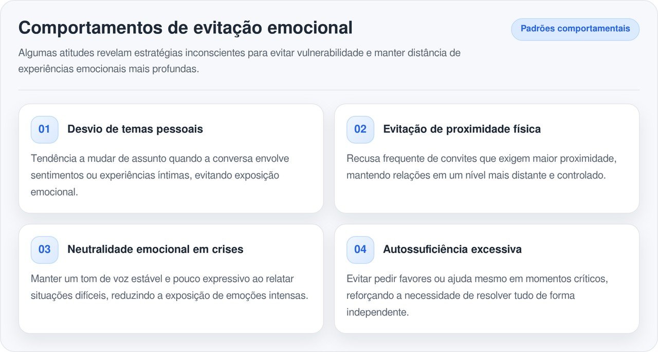 Identificar os padrões de afastamento emocional ajuda a compreender as razões pelas quais algumas amizades nunca evoluem para algo mais íntimo. A pessoa pode ser extremamente solícita e educada, mas raramente compartilha seus próprios problemas ou busca apoio nos momentos difíceis. Essa assimetria nas trocas afetivas mantém o indivíduo em uma posição de observador distante e protegido.