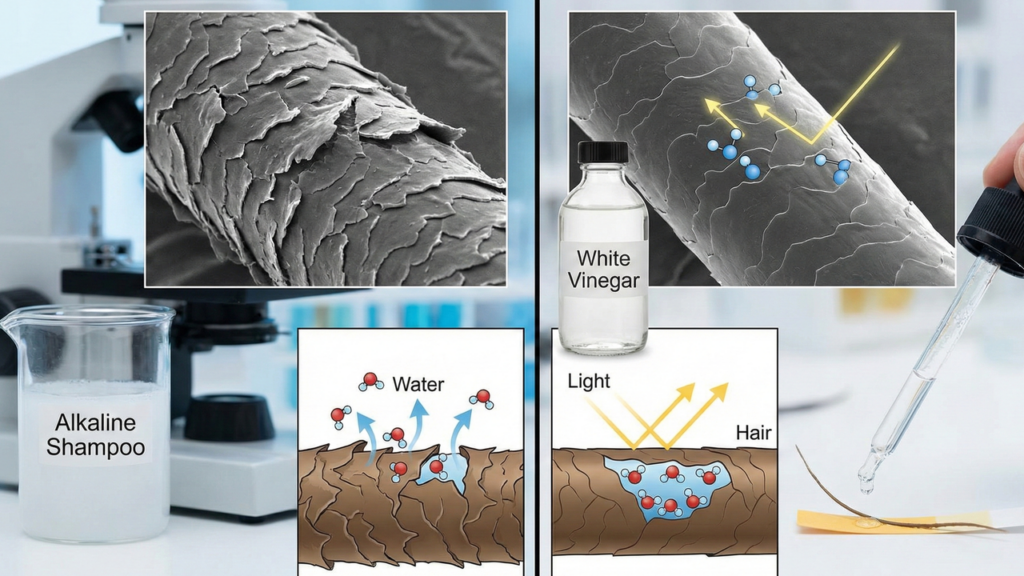 Para que serve o vinagre branco no cabelo? Basicamente, ele atua como um agente acidificante que fecha as escamas dos fios abertas por processos químicos ou shampoos alcalinos. Essa ação evita a perda de nutrientes e umidade interna.