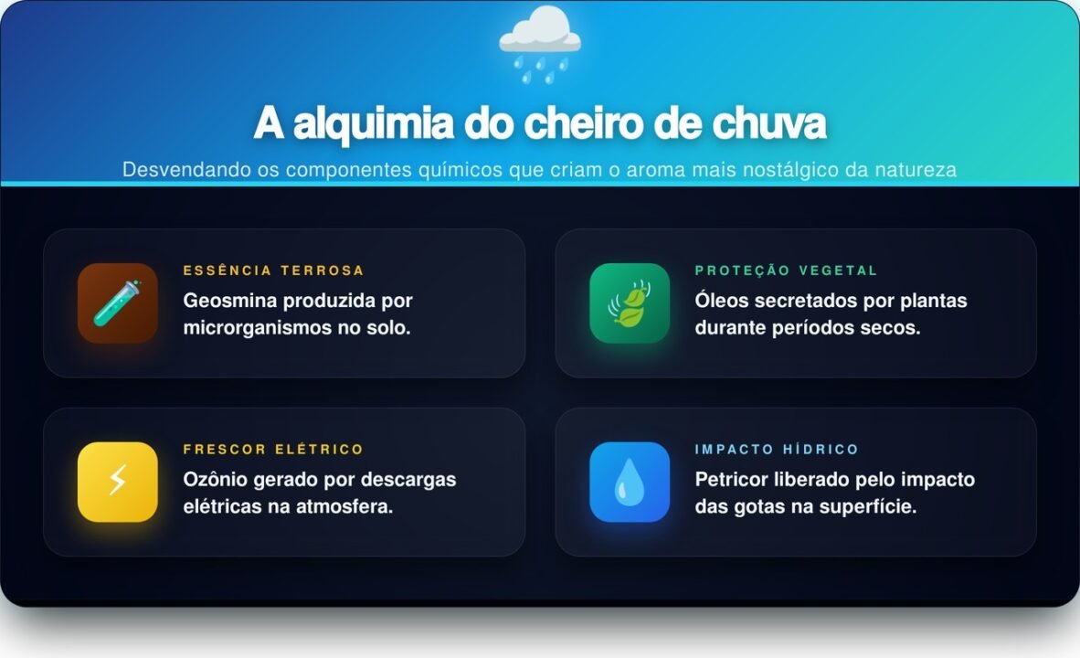 Esta interação química sofisticada resulta em uma série de elementos que compõem o aroma que tanto apreciamos em dias nublados: