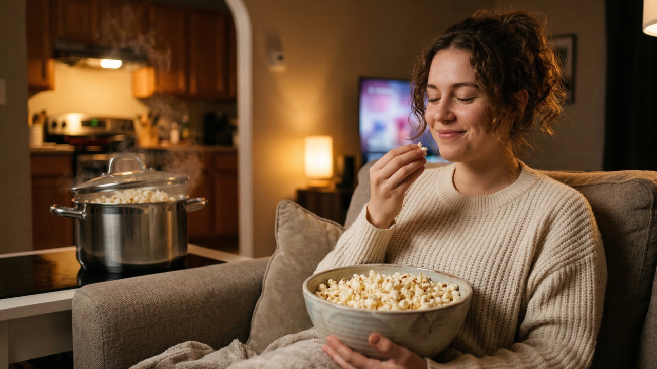 O ambiente de casa e a prática de assistir filmes criam um contexto onde o som da pipoca é o sinalizador de descanso. Essa memória afetiva é construída desde a infância, consolidando a ideia de que o estalo metálico é o prelúdio de um momento livre de preocupações. A mente associa o ruído à proteção e ao convívio familiar íntimo.