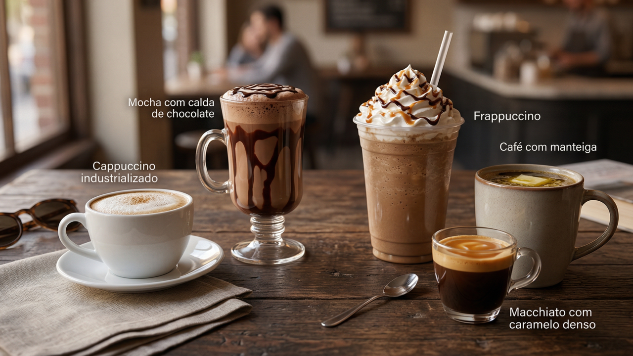 A diversidade de opções no mercado inclui variações que agregam elementos ricos em gordura e açúcares refinados na receita. Muitas dessas bebidas são consumidas como lanches rápidos, mas possuem o valor energético equivalente a uma refeição completa e densa. É fundamental observar os acompanhamentos que transformam o grão em algo pesado para a circulação sanguínea.