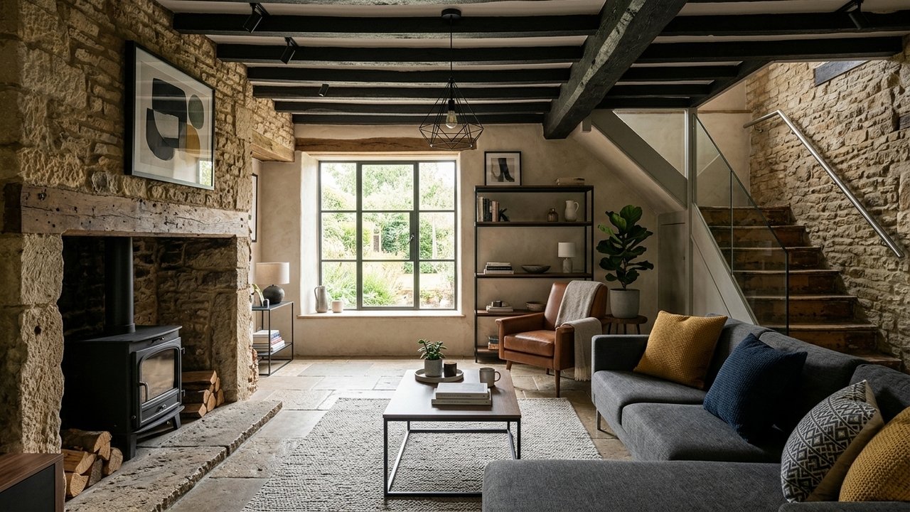 O contraste respeitoso é a chave. Uma paleta neutra de off-white e texturas naturais realça a madeira escura ou os tijolos aparentes. Isso cria uma base serena para a entrada de móveis atuais.