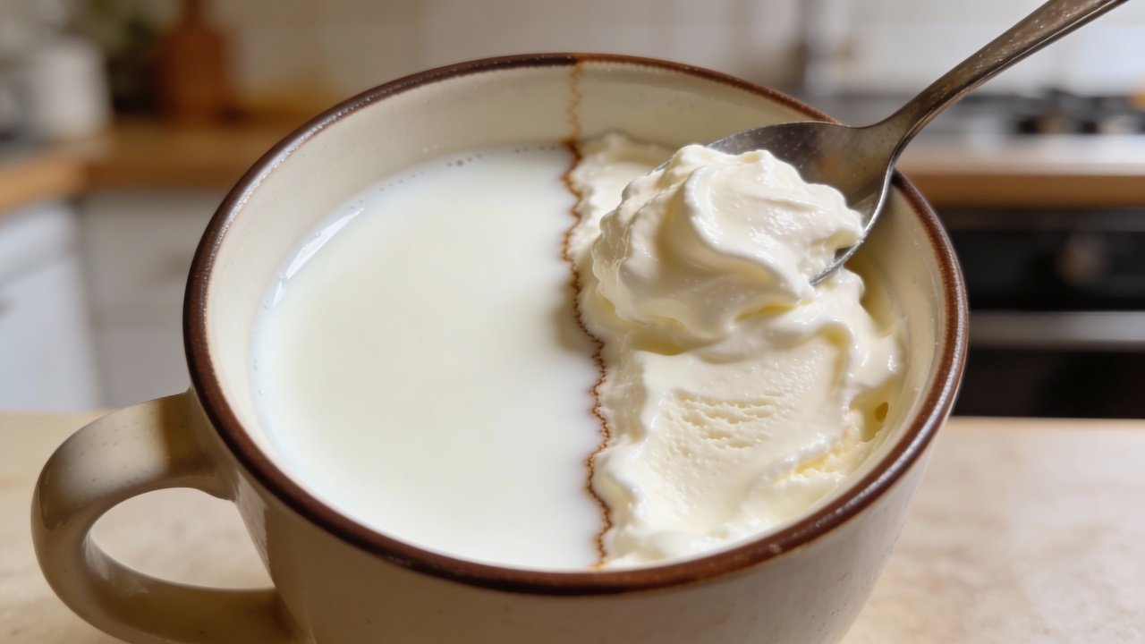 Creme de leite fresco tem 30-40% gordura vs. 3-4% do leite integral, alterando textura cremosa em cafés e receitas rápidas.