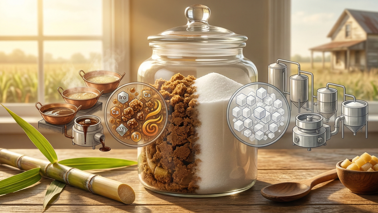 O açúcar mascavo é obtido diretamente do cozimento do caldo de cana, preservando o melaço e mantendo minerais como cálcio, ferro e magnésio em sua composição original. Por não passar por processos químicos de branqueamento, ele mantém um sabor robusto e terroso, sendo considerado uma opção menos processada pela indústria alimentícia moderna e muito mais nutritiva.