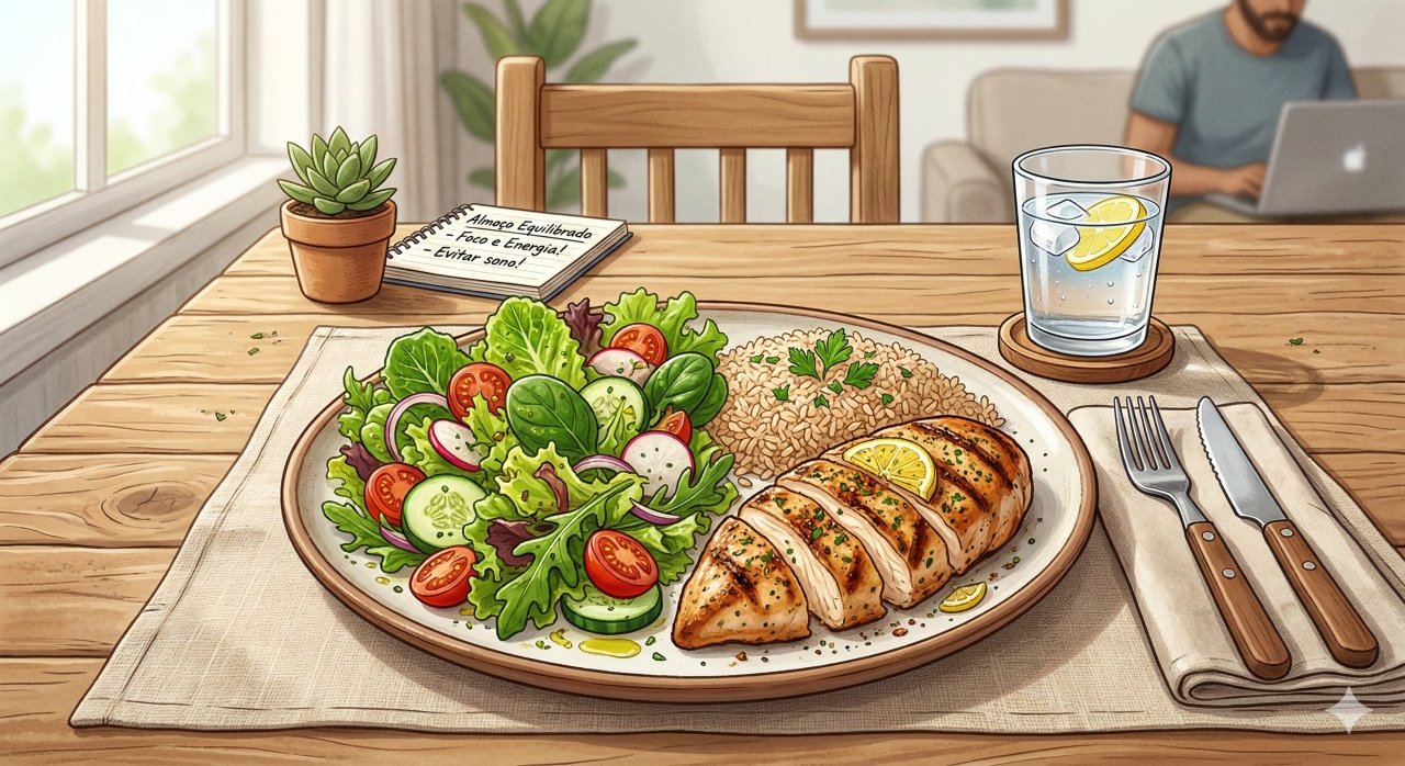 O sono após o almoço pode ser minimizado com um prato nutricionalmente balanceado. Nutricionistas sugerem dividir o prato da seguinte forma: metade com vegetais e salada, um quarto com proteína magra e um quarto com carboidrato complexo. Essa proporção otimiza o metabolismo e fornece energia sustentada.