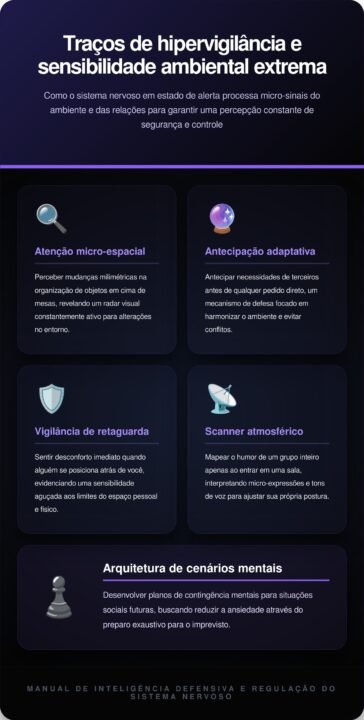 Analisar todas as saídas de emergência e posicionar-se estrategicamente em locais públicos são sinais claros dessa mente vigilante. Esse comportamento ocorre sem esforço consciente, sendo uma herança direta da necessidade de fuga rápida cultivada durante os anos de infância. O indivíduo sente-se confortável apenas quando possui o controle visual total sobre quem entra ou sai do seu espaço.