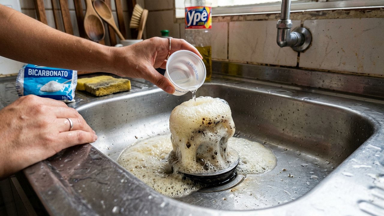 A eficácia dessa limpeza acelerada depende diretamente da proporção correta dos produtos e da ordem exata de execução. Você precisa esvaziar totalmente a cuba suja antes de derramar qualquer ingrediente no ralo principal.