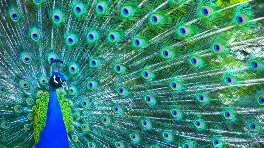 As penas dos pavões devem suas cores a um fenômeno chamado iridescência. Estruturas microscópicas nas penas refletem a luz, criando tons de azul, verde e dourado. Esse efeito visual não depende de pigmentos, mas da interação da luz com a estrutura das penas. Observar essas cores pode ser uma forma de terapia visual, ajudando a relaxar a mente.