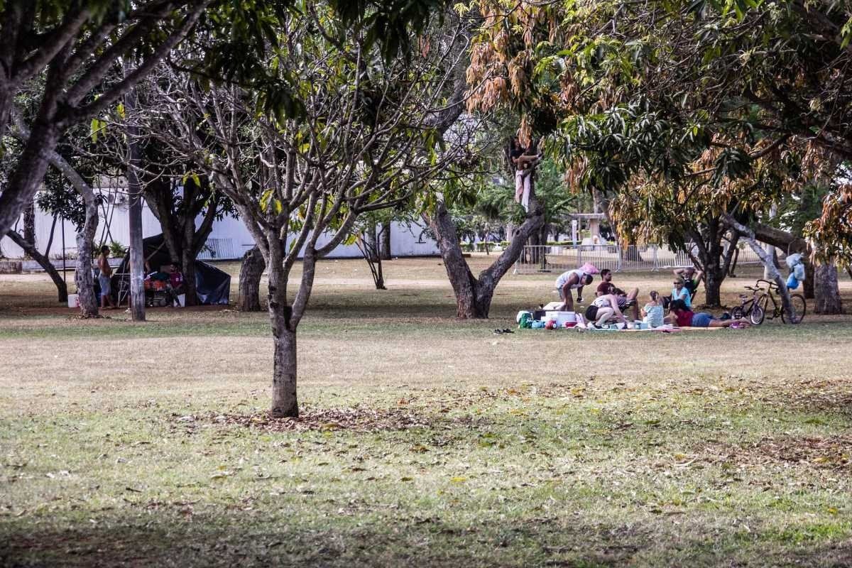 A estudante Júlia Silva Cordeiro, 17 anos, aproveitou que o tio iria tocar na programação do Complexo Cultural para passar a tarde aproveitando com as primas Ananda Galvão Borges, 14, e Cecília Lopes, 11 meses. “É bom para tomar um vento, sair de casa e aproveitar mais ao ar livre. São coisas que não conseguimos fazer sempre”, afirma.
