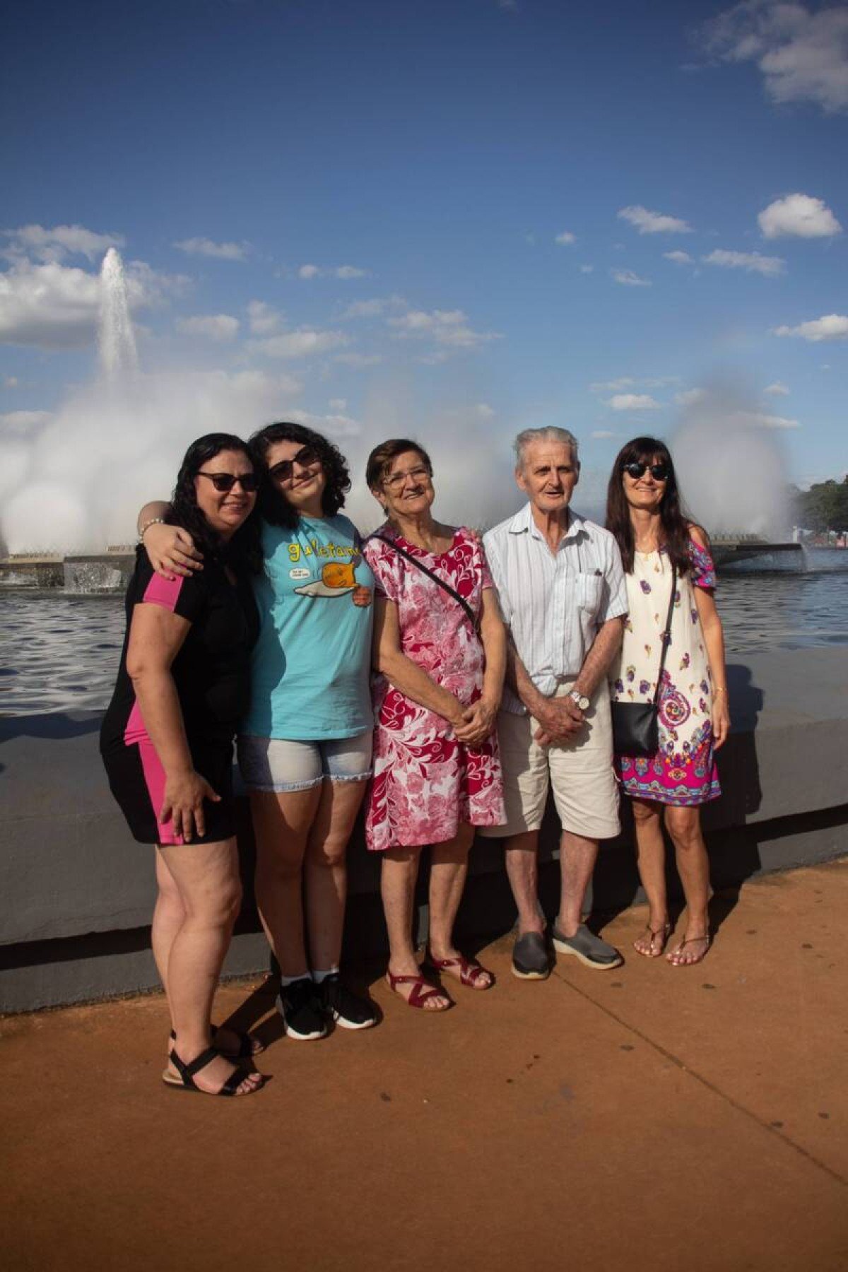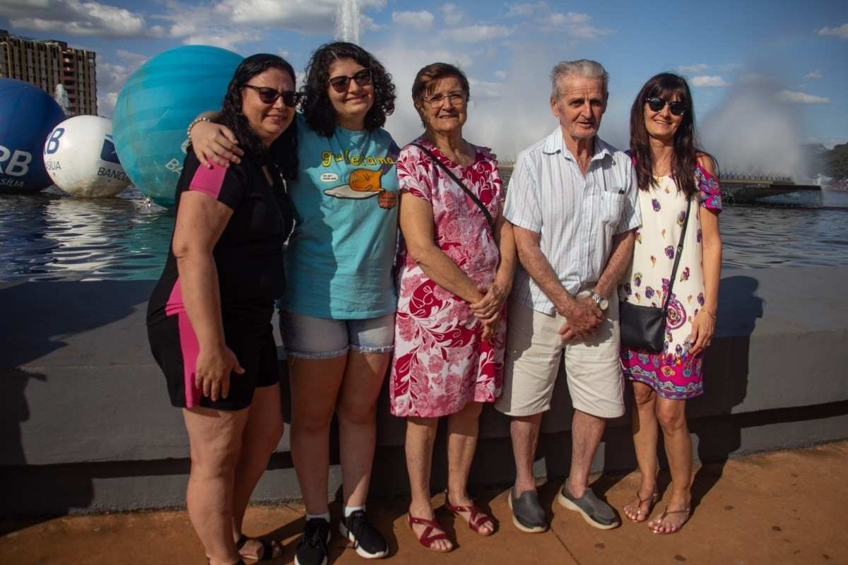 Turistas em Brasília, a família Donadelle, de São Paulo, veio especialmente para o aniversário da capital. “Nós amamos Brasília e nossa filha e netos moram aqui, então sempre que dó nós estamos aqui”, conta Margarida Donadelle, 82 anos. Ela e o marido, Nelson Donadelle, 88, estavam curtindo a fonte da Torre de TV. “É uma coisa nova, que não conhecemos e é mais tranquilo para idosos”, brinca.