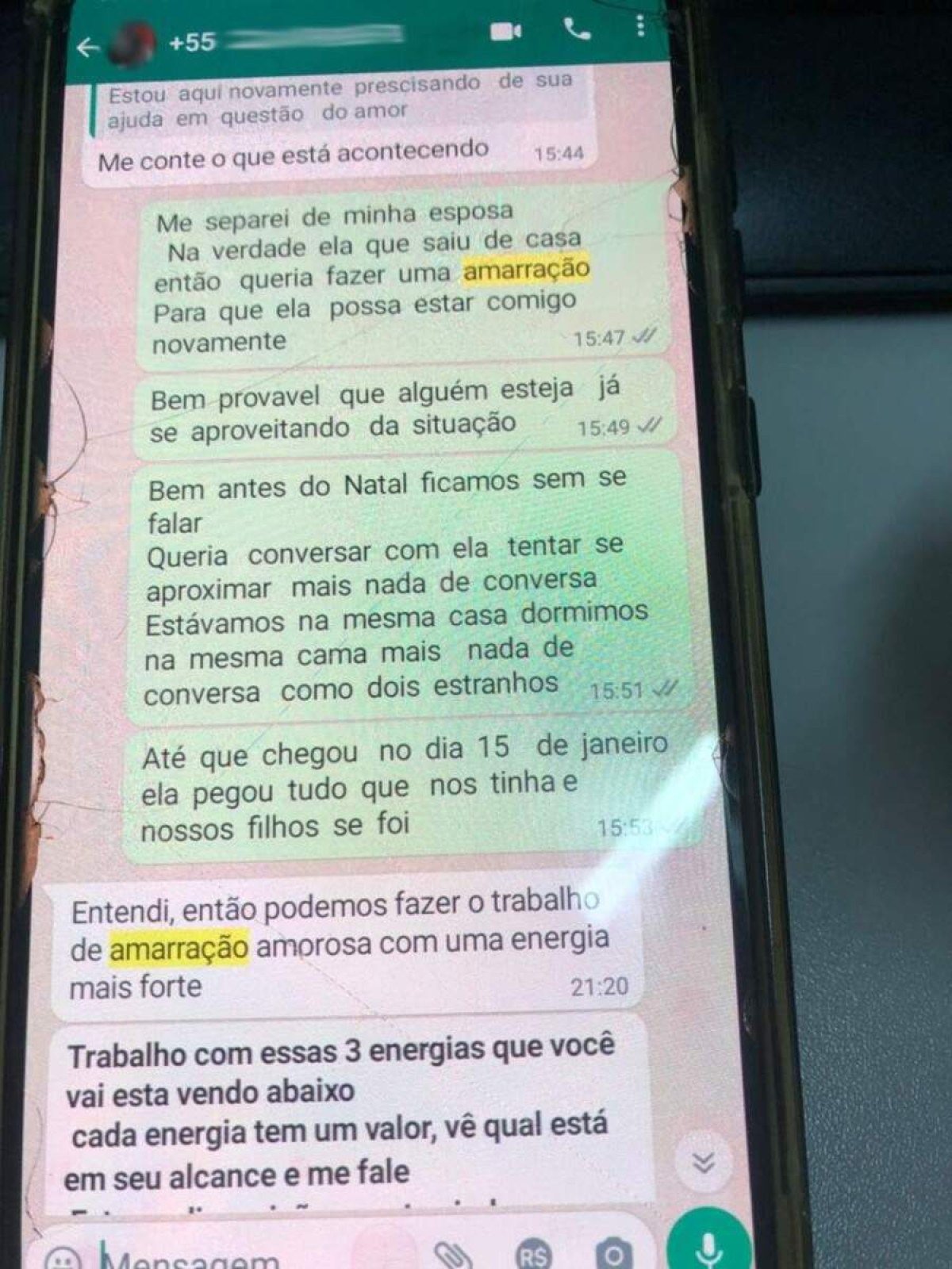 Além disso, o homem admitiu à polícia ter encomendado uma "amarração amorosa” com místicos para fazer com que a mulher voltasse para ele. No celular dele, os investigadores encontraram três conversas com três guias espirituais diferentes. O "trabalho" foi fechado com um deles pelo valor de R$ 307, mas a ex-companheira não voltou.