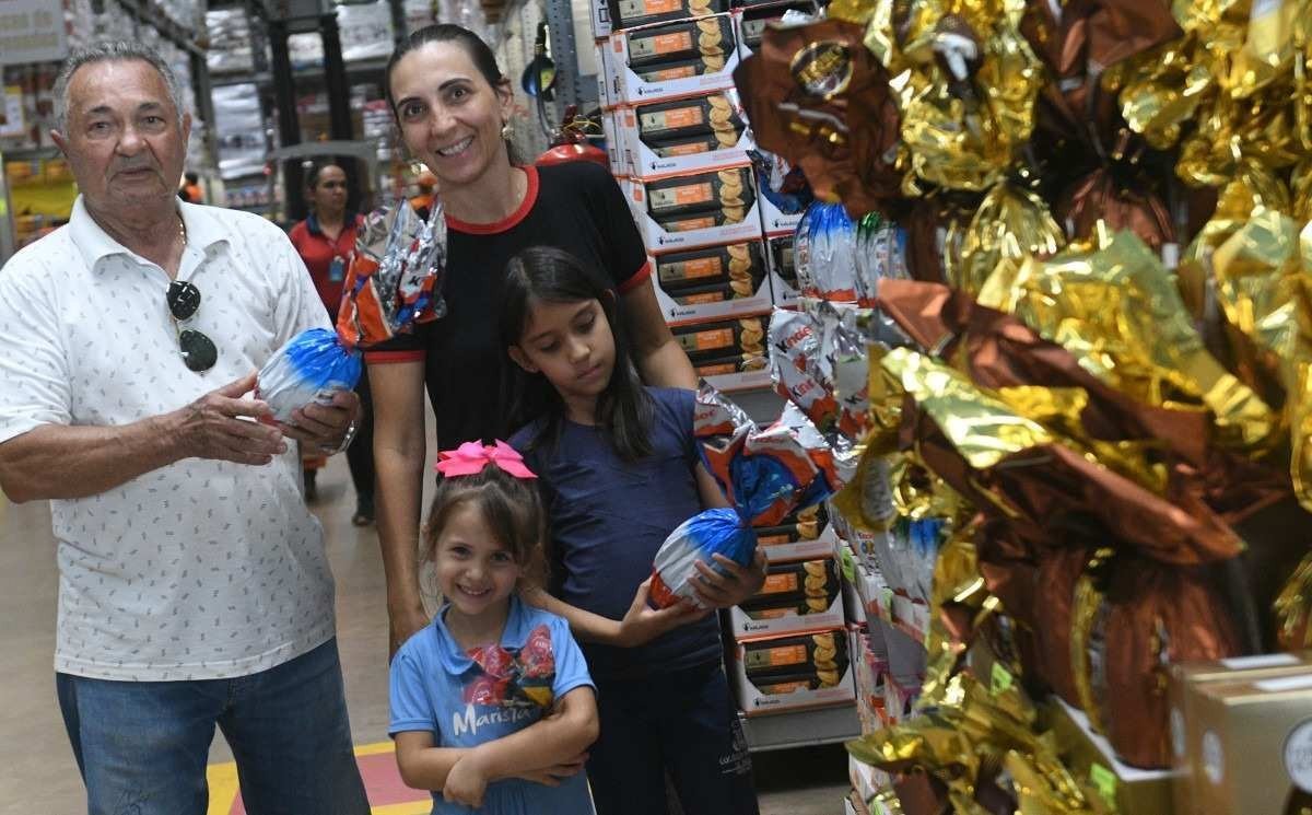Elemento tradicional na celebração da Páscoa, o ovo chocolate representa a vida e o renascimento para os cristãos. A professora de artes Janaína Menezes, 45, faz questão de manter a tradição e foi com a família a um atacadão para fazer as compras. Junto das filhas Rafaela, 7, Antonella, 4, e do pai Agilson Almeida, 72, ela comenta que o ovo da Páscoa ainda simboliza o amor em forma de presente. "A gente gosta de presentear os pequenos, como as minhas filhas e duas sobrinhas. Por isso que pegamos poucos ovos, porque fazemos uma torta ou um doce para economizar", explica a moradora da Asa Sul.