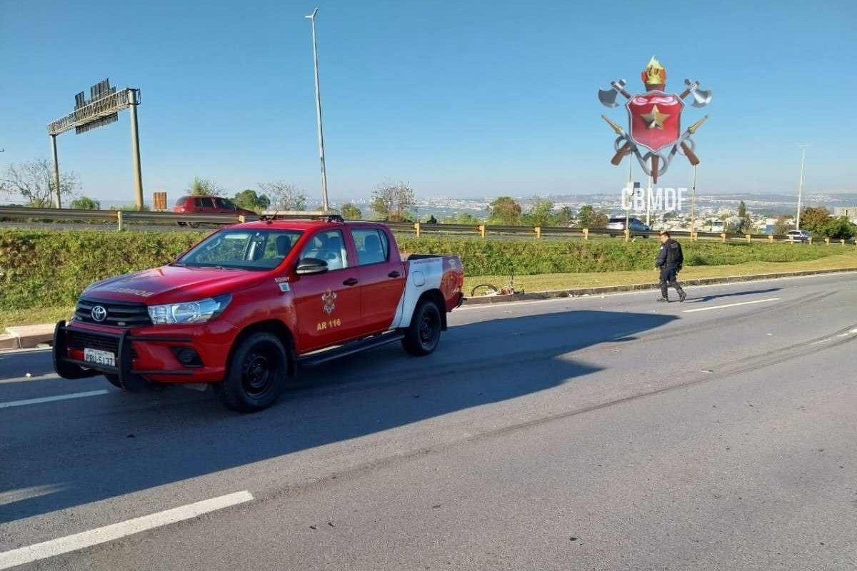 Acidente com moto, caminhão e bicicleta na DF-003 deixa ferido