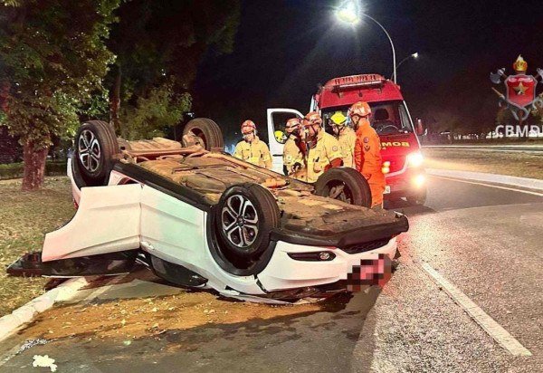 As equipes do Corpo de Bombeiros (CBMDF) encontraram um Honda HR-V branco capotado e um Honda HR-V prata danificado. A motorista do carro capotado estava consciente e orientada e foi levada para o Hospital de Base de Brasília (HB).