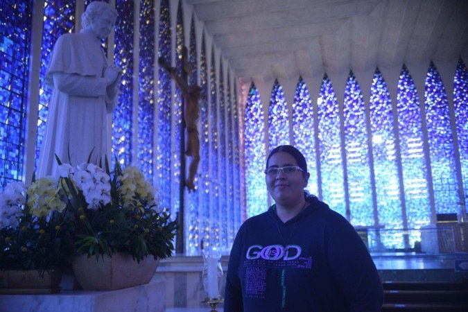 Moradora de Brasília, a professora Márcia Ramos, 56, visitou o santuário pela primeira vez ao lado da cunhada, que veio de Porto Alegre, e da filha. Para ela, os vitrais são uma verdadeira obra de arte. "Vimos fotos da igreja com sol, e ela fica belíssima. Mas mesmo em um dia nublado, continua linda", conclui.