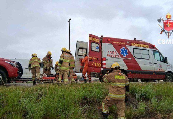 Ao chegarem ao local da ocorrência os bombeiros encontraram o carro, um Fiat Mobi, danificado após a batida e caído na lateral da via. Não há informações sobre a dinâmica do acidente.