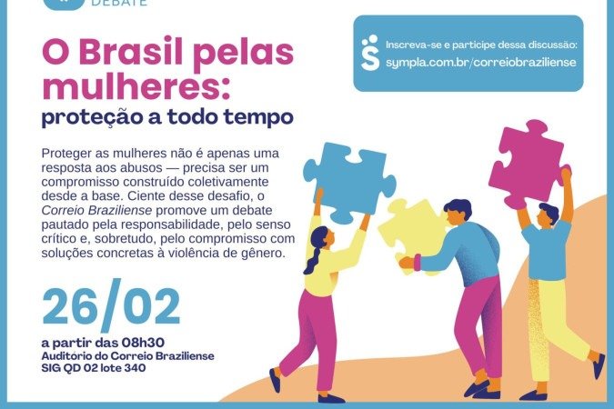 Ainda dá tempo de retirar os ingressos gratuitos para o CB.Debate "O Brasil pelas mulheres: proteção a todo tempo", que acontece nesta quinta-feira (26/2), no auditório do prédio principal do Correio Braziliense. Os ingressos podem ser retirados através do site Sympla. O debate reúne especialistas e autoridades para discutir soluções eficazes no combate à violência de gênero e na promoção de uma rede de proteção.