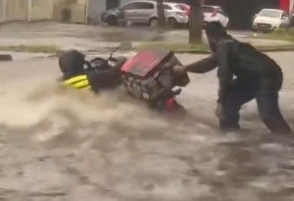 No setor P. Sul, um dos motociclistas foi socorrido por populares. Nas imagens, ele aparece agarrado à motocicleta, na tentativa de impedir que o veículo fosse levado pela força da água. Apesar do susto, a ajuda de quem estava no local permitiu a retirada da moto da enxurrada.